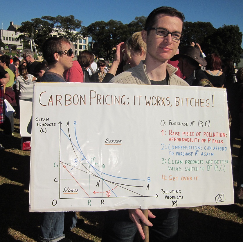 Secondly, to the (very) few who’ve picked the economics of the graph with any degree of rigour: by and large, your criticisms are correct. It would be absurd to try and fit a fully-fledged and nuanced economic justification of a multi-instrument response to anthropogenic climate change on a placard, so I didn’t even try. Instead, I used a simplistic graph (drawn from memory, rather than a textbook, my pseudo-intellectual superiority complex compels me to note) that would be recognisable to those who understand economics and whose principles could be easily explained to those who hadn’t.